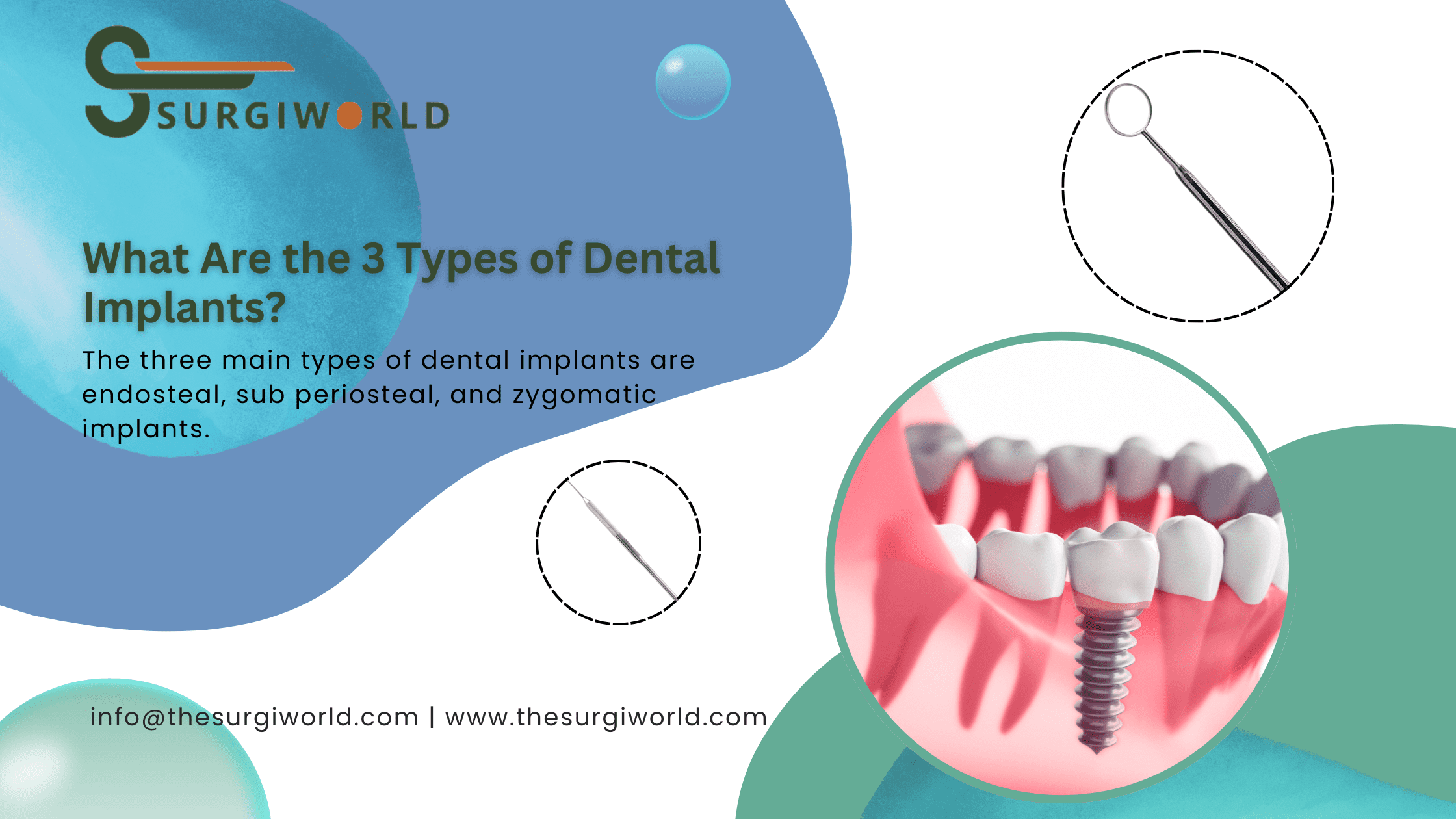 The three main types of dental implants are endosteal, sub periosteal, and zygomatic implants. Endosteal implants are the most common and are placed directly into the jawbone, making them strong and long-lasting. Sub periosteal implants sit on top of the jawbone but beneath the gums, ideal for patients with low bone density who cannot undergo grafting. Zygomatic implants are the least common and most complex, anchored in the cheekbone rather than the jaw, usually for cases of severe bone loss.